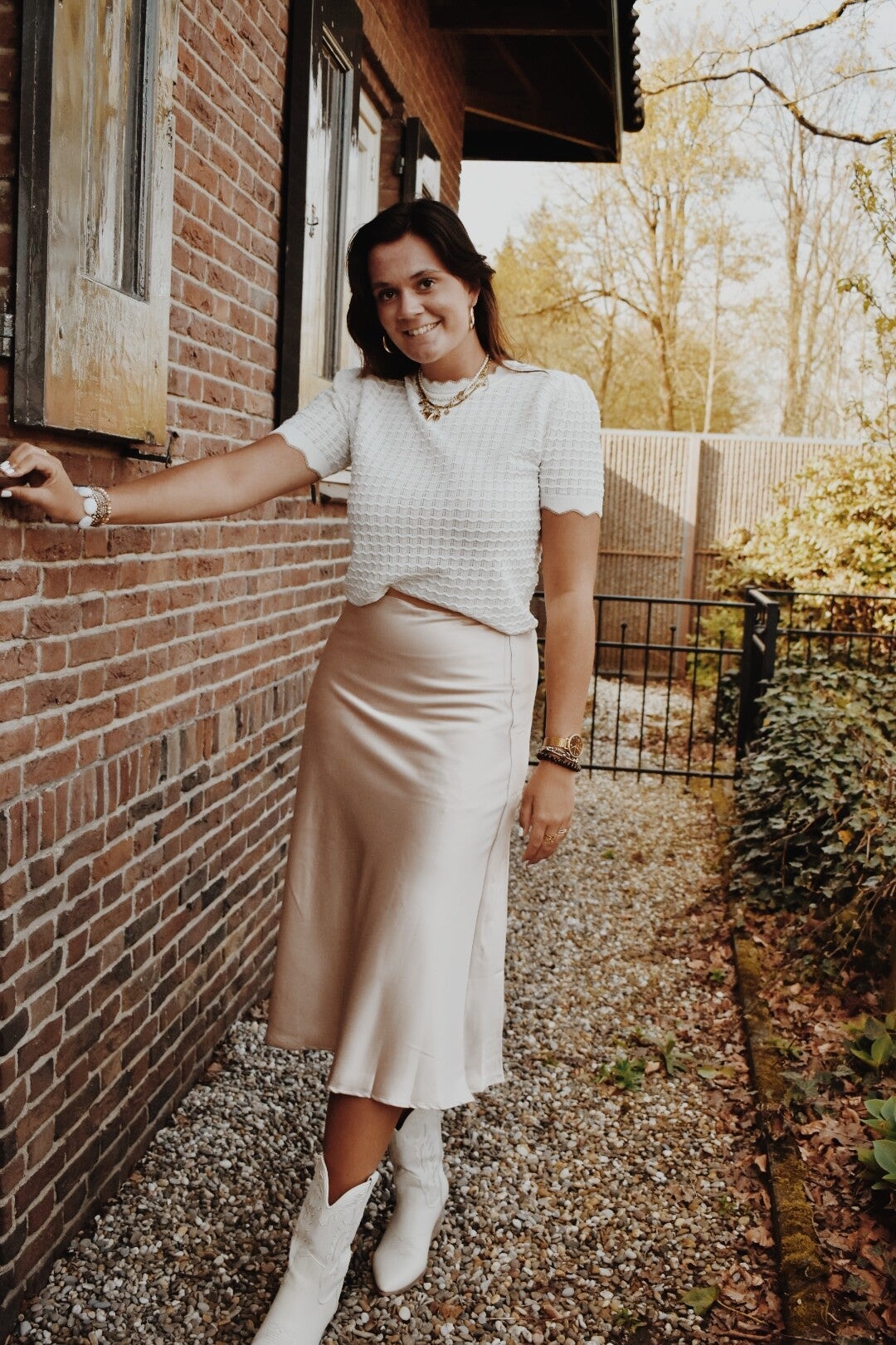 Een feestelijke satijnen rok in de mooie kleur champagne.