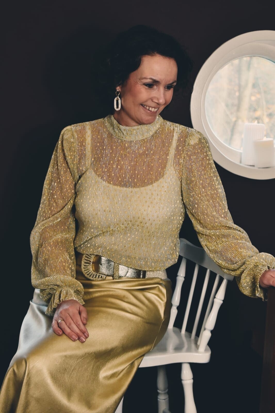 Een gave goude glitter top die super leuk te combineren is met de leather gold skirt.