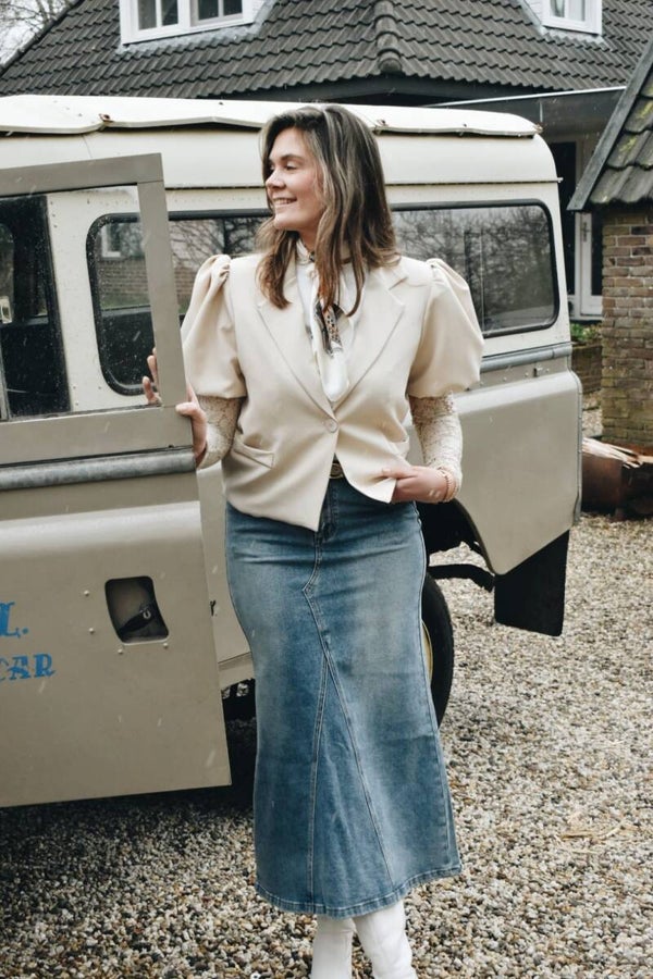 Een leuke blazer met trendy kanten mouwen. De blazer is ook verkrijgbaar in het beige. De blazer is one size en draagbaar van een S t/m L.