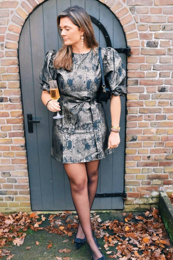 Hoe feestelijk is dit jurkje? Het jurkje heeft een zwarte ondertoon met goude glitter opdruk. Het jurkje heet aan de achterzijde een ritsluiting.