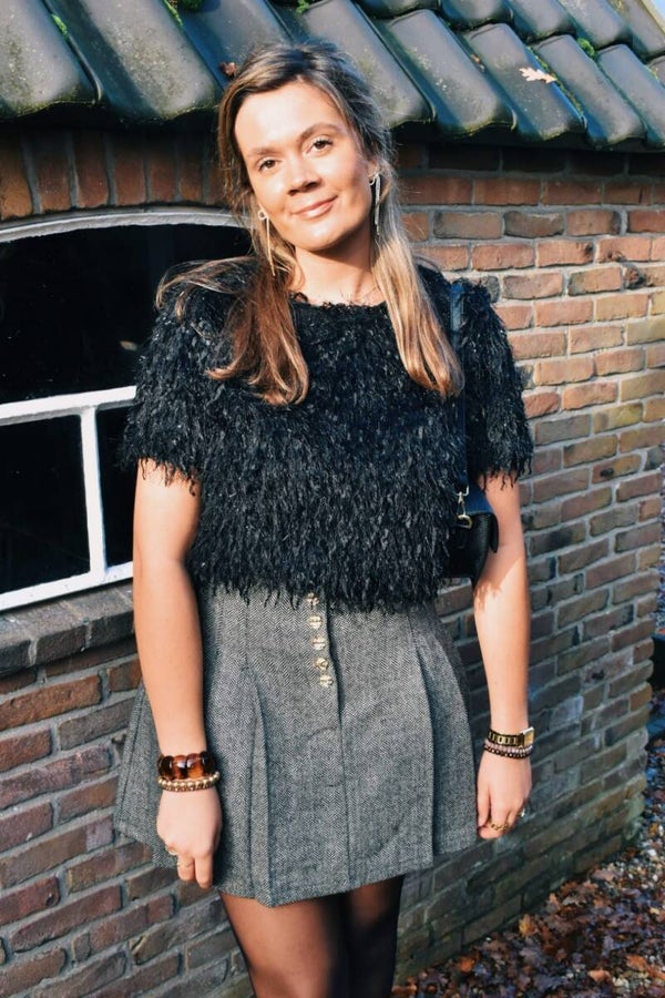 Een leuke fluffy top die feestelijk te combineren is op de black white chic skirt.