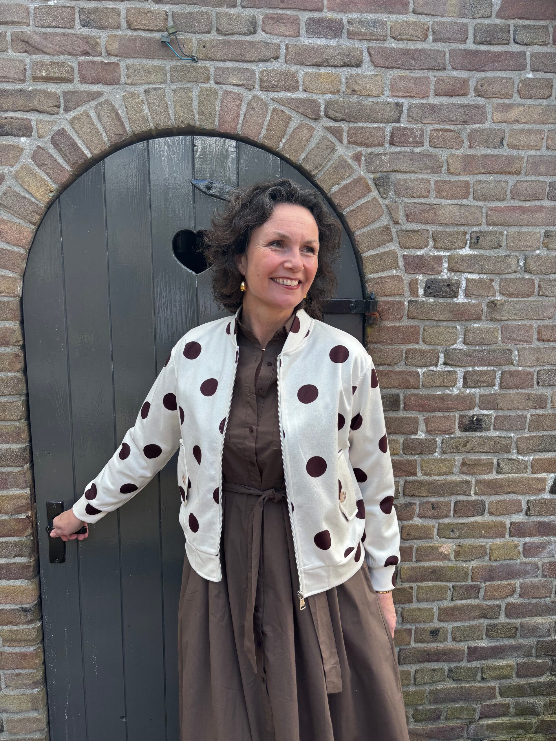 Een super leuk suède jasje met bruine stippen. Het jasje is verkrijgbaar in een s/m en l/xl.